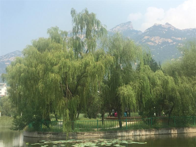 泰山廣場西側有一公園名曰御碑公園, 公園依山而建,園內(nèi)淺丘起伏,林木蔥郁,環(huán)境幽靜,根據(jù)高差,分為上下兩處水景,一棵棵柳樹倒映在水中,構成了一幅美妙的畫卷。